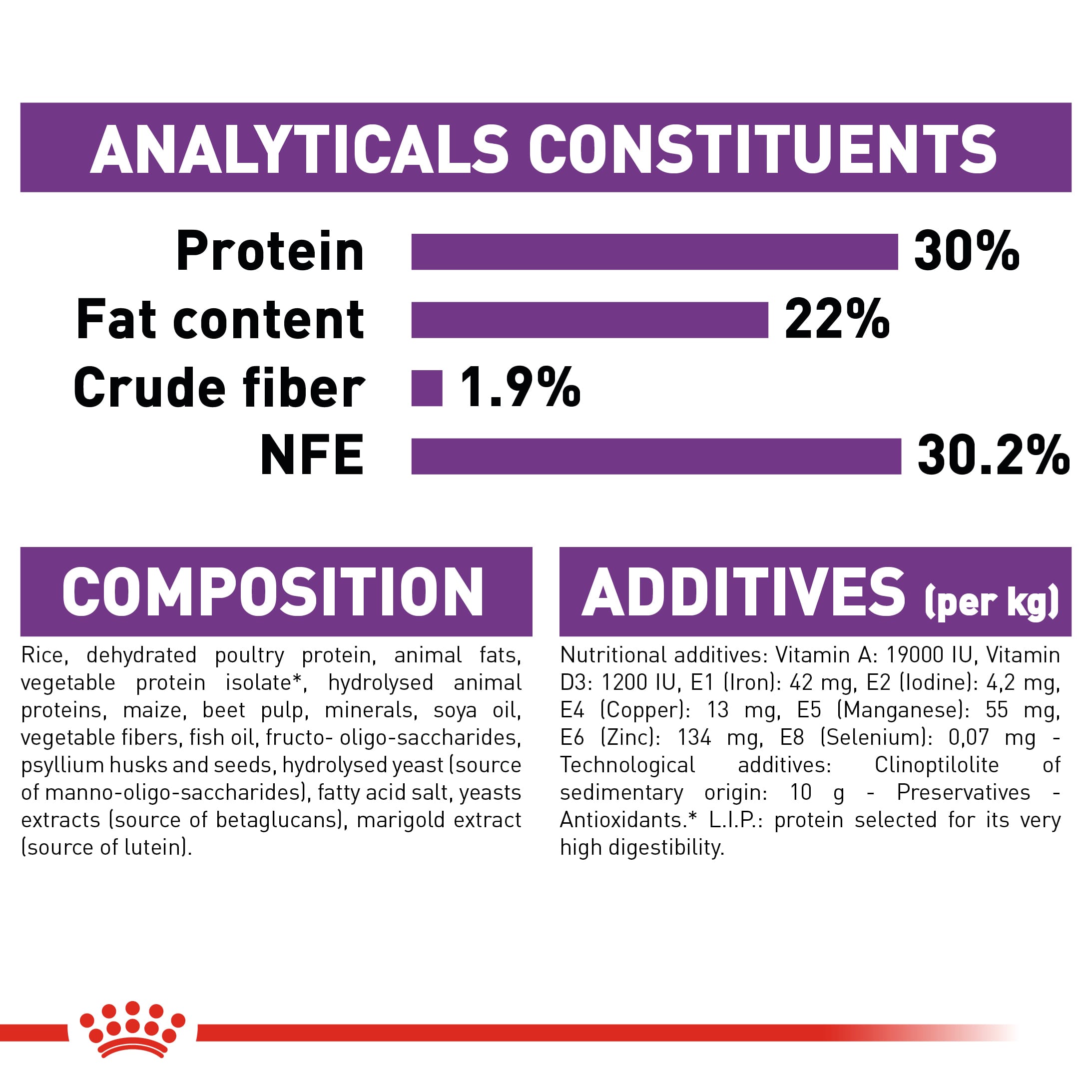 Nutritional profile which is adapted to the bitch’s high energy needs at the end of gestation and during lactation.